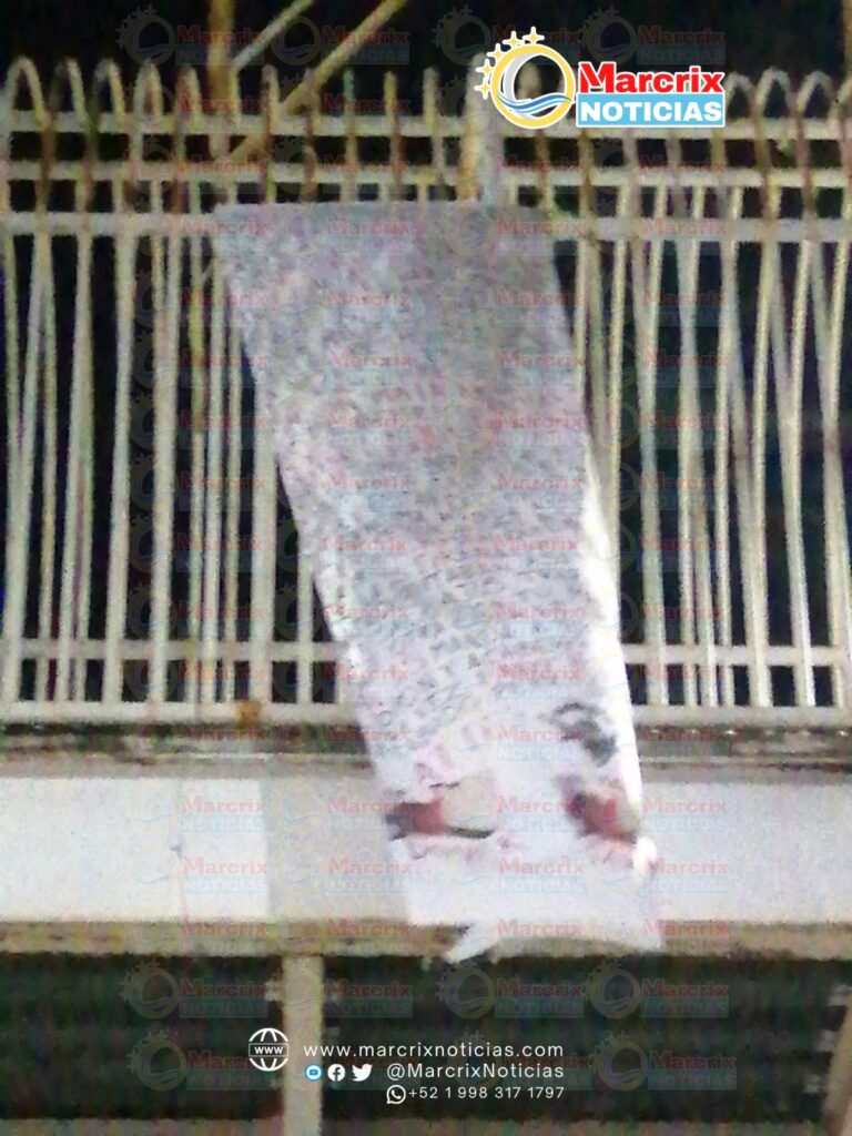 En la madrugada de este lunes fue colgada una manta en el puente peatonal que se ubica frente a la terminal de autobuses, sobre la avenida Tulum.