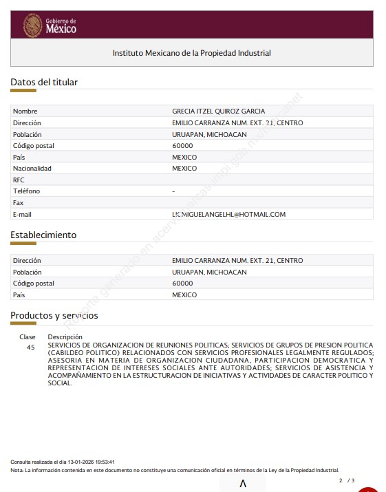 Ambas marcas fueron registradas en la clase 45 de productos y servicios, lo que les permite organizar reuniones políticas, ejercer presión política vinculada a servicios legalmente regulados y ofrecer asesoría en temas de organización ciudadana, participación democrática y representación de intereses sociales ante autoridades.