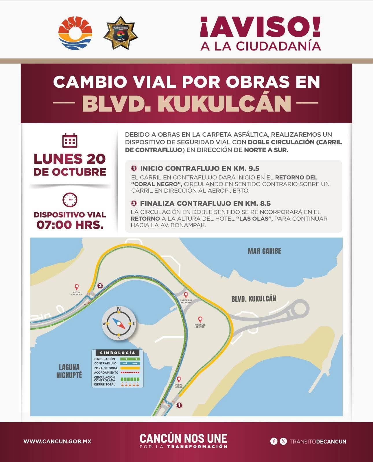 Cancún(Marcrix Noticias).- El Ayuntamiento de Benito Juárez anunció que este lunes 20 de octubre, a partir de las 7:00 am, se implementará un cambio en la circulación del Bulevar Kukulcán en la Zona Hotelera de Cancún. La medida responde a trabajos de mantenimiento en la carpeta asfáltica.