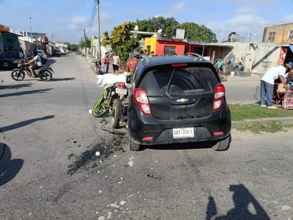 El automóvil de la marca Chevrolet, color gris oscuro, sin la debida precaución, efectuó un cambio de dirección en la intersección de la avenida Chetumal con calle Dominica y provocó que la motocicleta se estampara en su costado izquierdo.