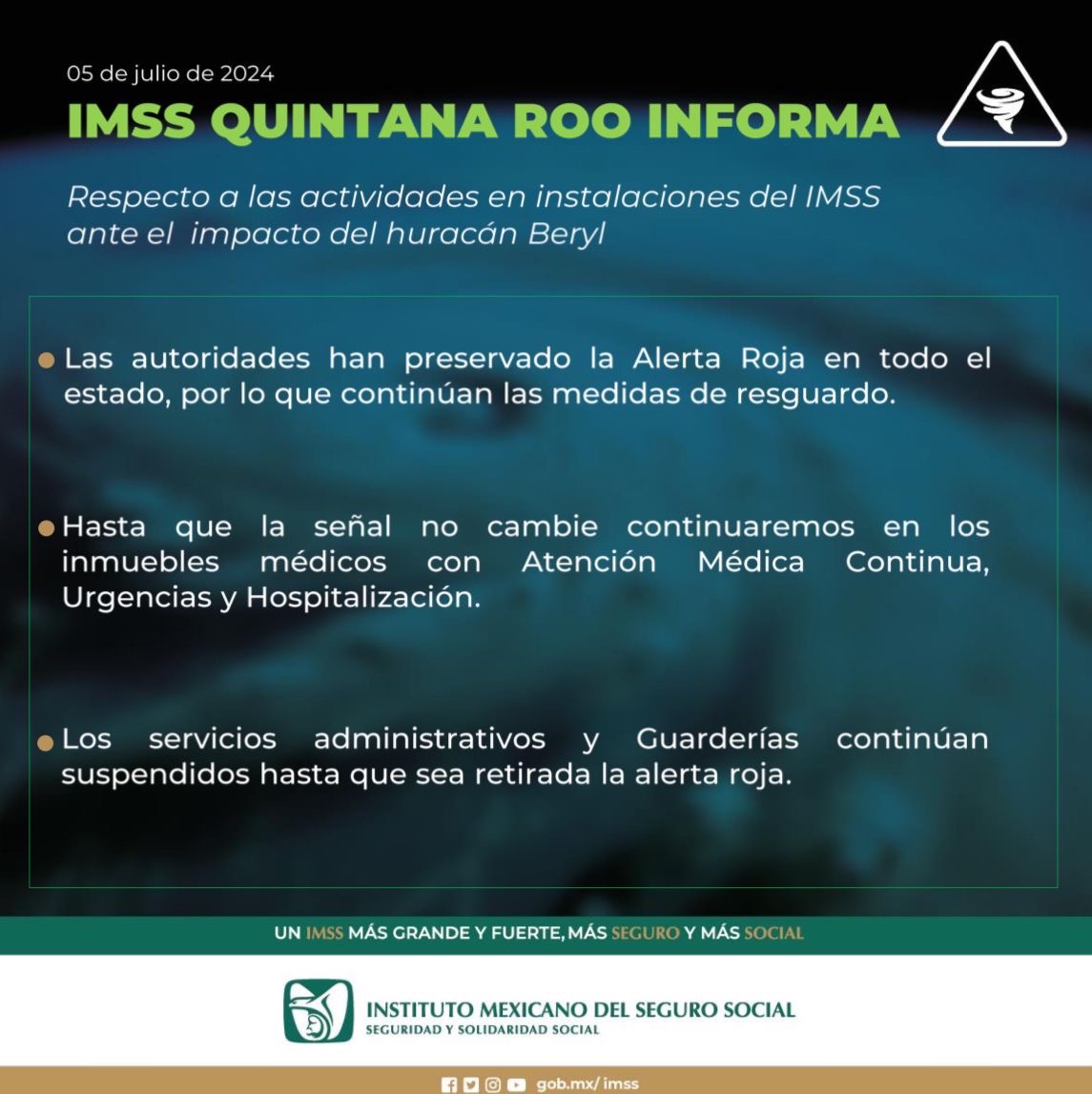 Cancún (Marcrix Noticias).- Continuarán suspendidas las actividades administrativas y guarderías en el IMSS de Quintana ROo, en tanto continúe activa la Alerta Roja por el paso del huracán Beryl, categoría 2.
