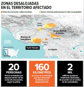 Mientras tanto, las autoridades locales reportan más de 20 arrestos por saqueos en zonas de evacuación y han impuesto toque de queda en áreas como Santa Mónica.