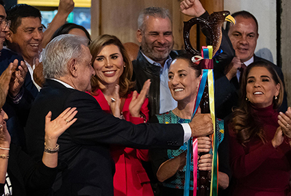 Retomando un ritual de los pueblos indígenas mexicanos, López Obrador cedió el bastón de mando a Sheinbaum, en lo que fue un baño de masas, a las afueras de un restaurante -por no ser un acto oficial- a unos pasos del Zócalo de la CDMX.