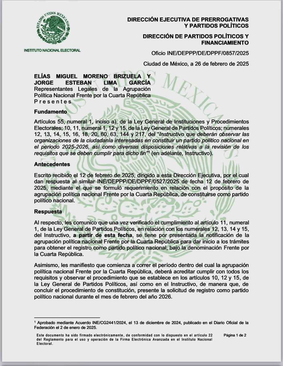 A través del oficio INE/DEPPP/DE/DPPF/0857/2025, fechado el 26 de febrero de 2025, la Dirección Ejecutiva de Prerrogativas y Partidos Políticos informó a Elías Miguel Moreno Brizuela y Jorge Esteban Lima García, representantes de la agrupación, que su solicitud cumple con los requisitos iniciales establecidos en la Ley General de Partidos Políticos y el instructivo aplicable para la creación de nuevas fuerzas políticas.