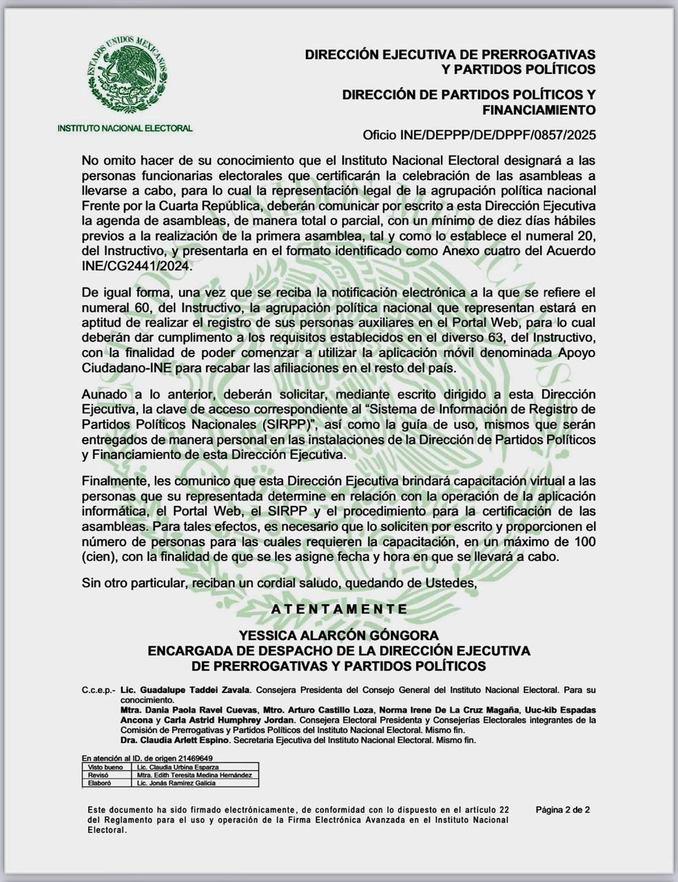 Si el Frente por la Cuarta República logra cumplir con todos los requisitos establecidos por el INE, podrá solicitar su registro en febrero de 2026, fecha en la que se definirá si oficialmente se convierte en un nuevo partido político nacional.