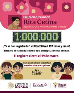 Ciudad de México. ( Marcrix 6).- El registro para la Beca Rita Cetina, destinada a estudiantes de educación primaria pública, comenzó el 2 de marzo de 2026 y estará abierto hasta el 19 de marzo, permitiendo a madres, padres y tutores inscribir a los niños y niñas para recibir un apoyo económico anual de 2 500 pesos destinado a la compra de útiles escolares y uniformes.