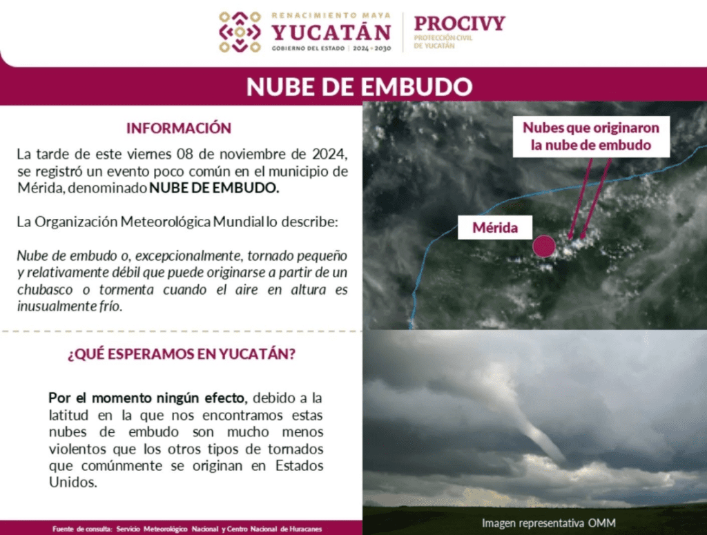 Según Protección Civil de Yucatán (PROCIVY), la nube de embudo es un tipo de vórtice atmosférico que, aunque visualmente similar a un tornado, no representa el mismo nivel de peligrosidad.