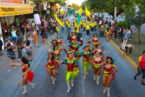 Playa de Carmen, Quintana Roo, (MARCRIX Noticias), 1 de marzo de 2025.— Música, baile, ritmo, color y mucha diversión en el segundo paseo de carros alegóricos y comparsas del “Carnaval del Pueblo” Playa del Carmen 2025, que deleitó a más de 15 mil espectadores reunidos a lo largo del derrotero que cubrió vialidades del primer cuadro de la ciudad, incluyendo la zona turística.