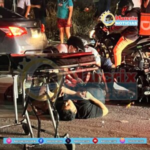 Cancún (Marcrix Noticias) – Dos motociclistas resultaron lesionados este jueves en la avenida Costa Maya, en Cancún, tras un choque de motocicletas en Cancún que autoridades atribuyen a una invasión de carril. El percance generó la movilización inmediata de servicios de emergencia privados en la zona.