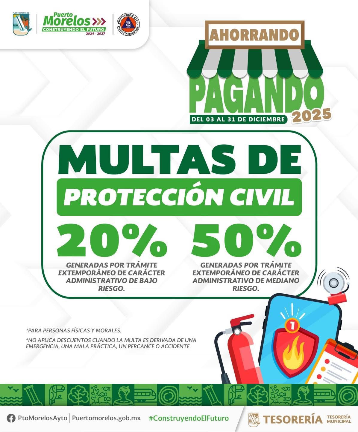 El área de Fiscalización otorgará el 25 por ciento en multas por procedimientos de inspección y verificación a establecimientos comerciales de bajo riesgo. Y En los procedimientos de Protección Civil se dará 20 por ciento por trámites extemporáneos de carácter administrativo, de bajo riesgo para personas físicas y morales, 50 por ciento en multas generadas por trámite extemporáneo, de carácter administrativo, de mediano riesgo para personas físicas y morales.