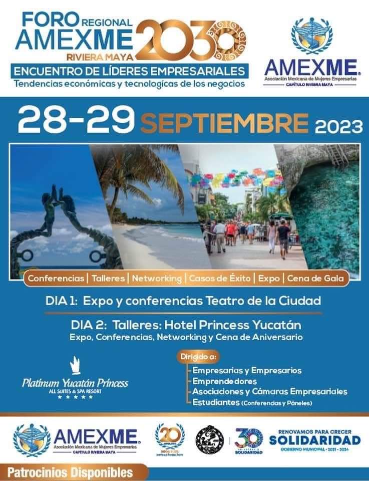 Playa del Carmen, Solidaridad, (MARCRIX Noticias), 6 de septiembre del 2023.- La AMEXME, en alianza con el gobierno municipal dirigido por Lili Campos, llevará a cabo el “Foro Regional 2030 Encuentro de Líderes Empresariales”, donde se abordarán temas de tendencias económicas y tecnológicas de los negocios, en un espacio abierto para la ciudadanía en general y con becas para la comunidad estudiantil, el 28 de septiembre en el Teatro de la Ciudad y el 29 en el Hotel Princess.