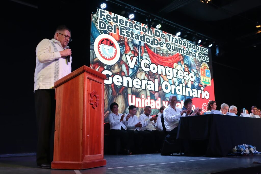 (MARCRIX Noticias).- En el marco del V Congreso General Ordinario de la Federación de Trabajadores del Estado de Quintana Roo, trabajadores y delegados dieron el voto de confianza a la mesa directiva encabezada por Isidro Santamaría Casanova para continuar su liderazgo como Secretario General del gremio en Quintana Roo, teniendo como testigo de honor al dirigente nacional de la CTM Carlos Humberto Aceves del Olmo.
