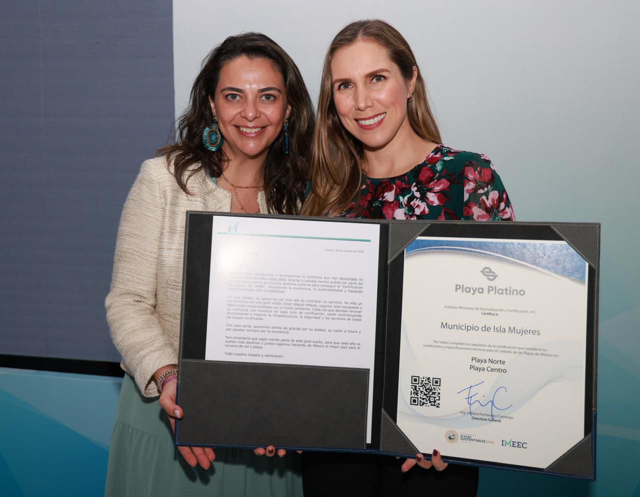 Isla Mujeres (Marcrix Noticias).– El Gobierno Municipal de Isla Mujeres, encabezado por la alcaldesa Atenea Gómez Ricalde, recibió por tercer año consecutivo la certificación Playa Platino para Playa Norte y Playa Centro, otorgadas por el Instituto Mexicano de Normalización y Certificación A.C. (IMNC).