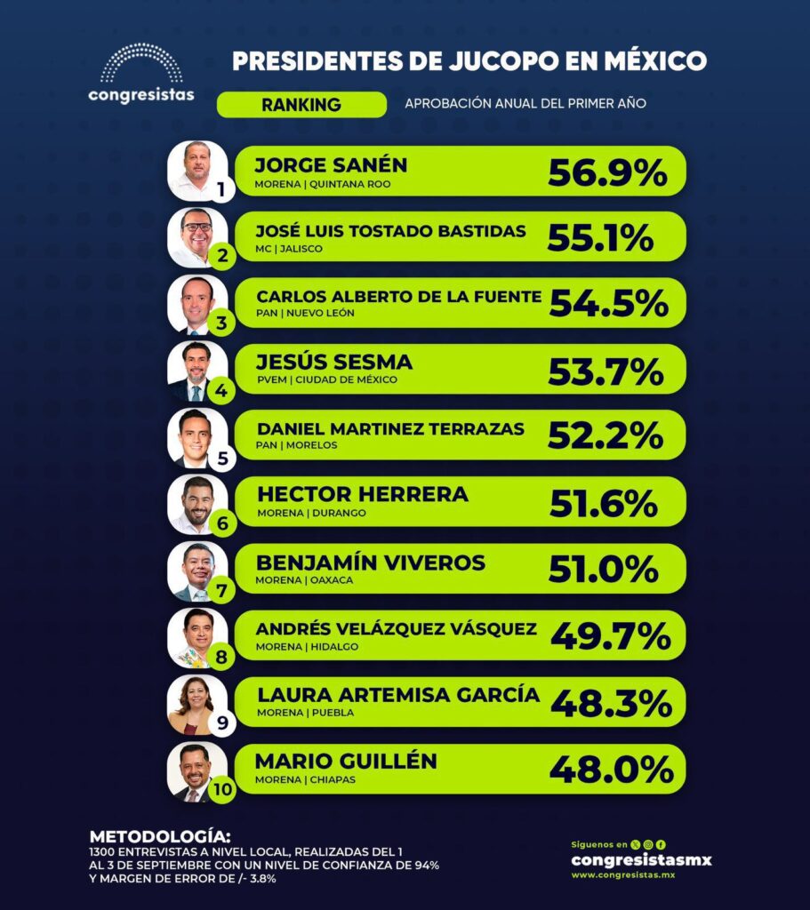 Chetumal (Marcrix Noticias).– Jorge Sanén Cervantes, Presidente del Consejo Estatal de Morena y coordinador del Grupo Legislativo en el Congreso de Quintana Roo, fue reconocido como el presidente de la Junta de Gobierno y Coordinación Política (JUGOCOPO) mejor evaluado del país, según el más reciente ranking elaborado por Votantes y difundido por Congresistas.org.