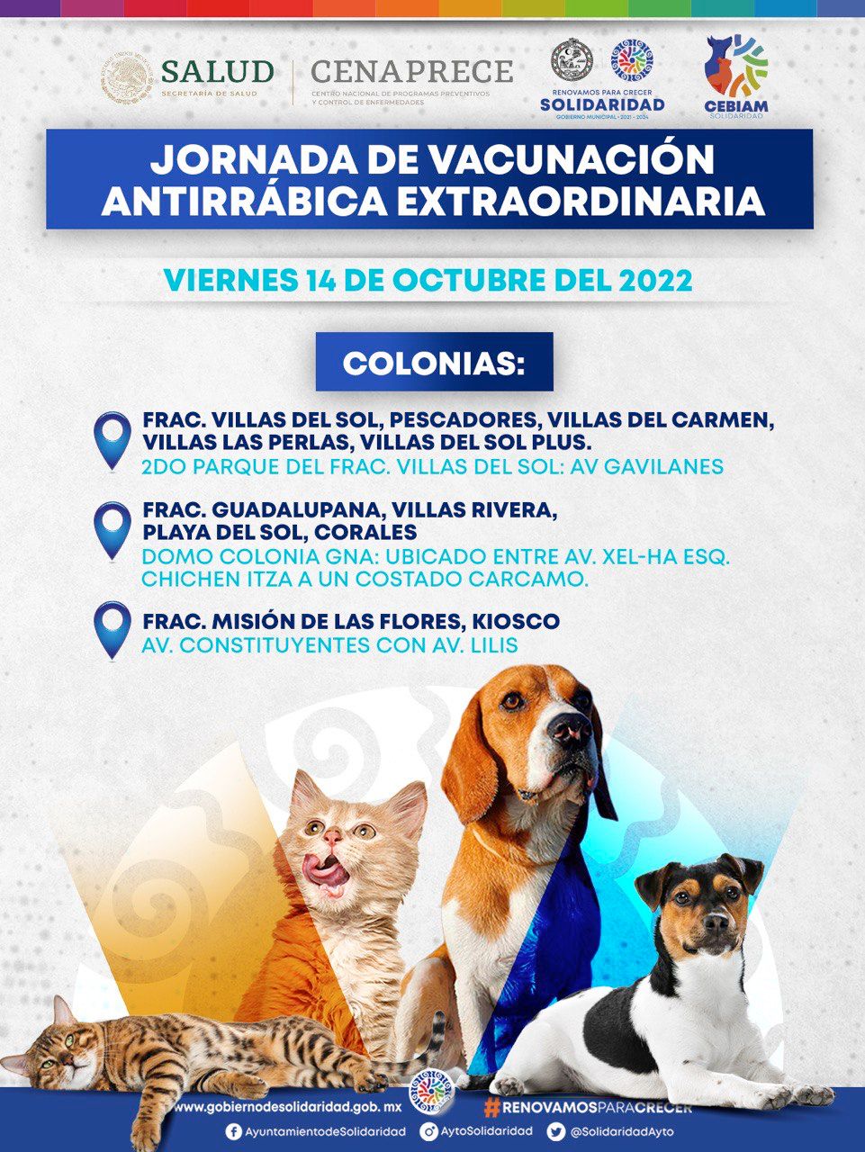 Playa del Carmen, Solidaridad, 13 de octubre de 2022.- Ante la demanda de vacunas antirrábicas y para dar respuesta a la gente, la presidenta Lili Campos dispuso llevar a cabo jornadas extraordinarias para la protección de los animales, por lo que invita a los y las solidarenses a llevar sus mascotas el próximo viernes 14 de octubre a cualquiera de los 3 módulos que se instalarán en el municipio.