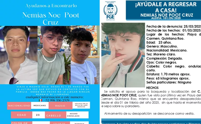 Playa del Carmen (Marcrix Noticias)-La incertidumbre y la angustia han marcado los últimos 26 días para la familia y amigos de Nemias Noé Poot Cruz, un joven de 23 años originario de Campeche, quien desapareció en Madrid, España, tras su llegada el pasado 1 de marzo. Su última comunicación con su madre fue el día de su arribo a la capital española, pero desde entonces no ha respondido a mensajes ni llamadas, lo que ha generado una creciente preocupación.