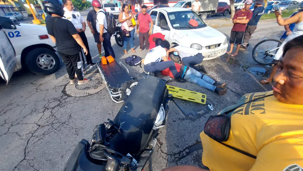 Un accidente vial ocurrió en la Región 95 de Cancún, cuando el conductor de un Chevrolet blanco impactó a una motociclista.