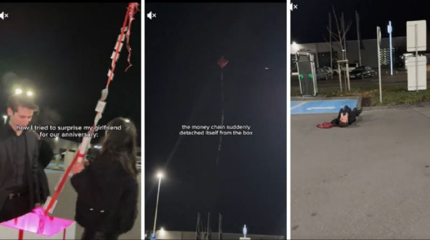 La sorpresa de aniversario y de San Valentín salió mal cuando los globos se soltaron y el dinero salió volando, un momento que se viralizó en redes sociales.