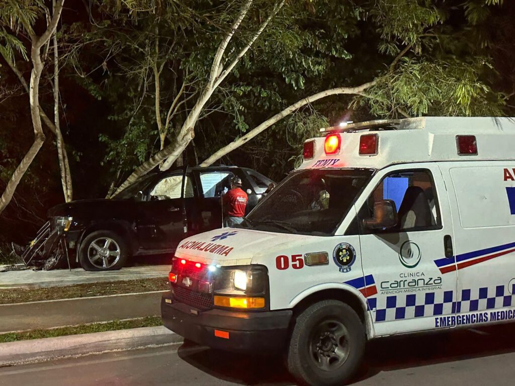 Chetumal (Marcrix Noticias).– La madrugada de este sábado se registró un aparatoso accidente en el Bulevar Bahía de Chetumal, a escasos metros de la Megaescultura, luego de que el conductor de una camioneta Avalanche perdiera el control y terminara chocando contra un árbol de mangle.