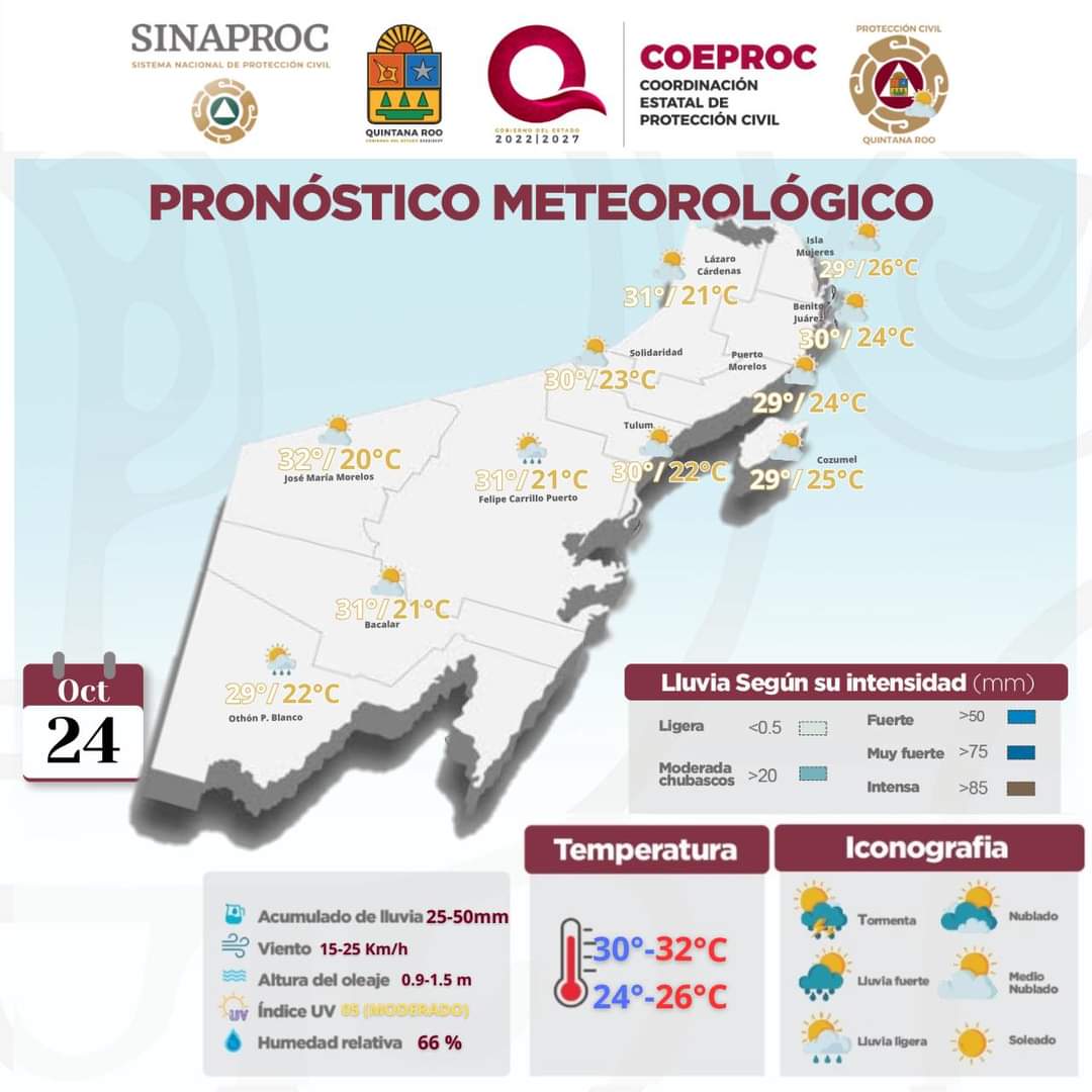 TIEMPO PROBABLE PARA EL ESTADO DE QUINTANA ROO:1.- BENITO JUÁREZ.- Cielo parcialmente nublado, lluvias con intervalos de chubascos. Ambiente muy caluroso. Viento del norte y noreste de 15 a 25 km/h con rachas más fuertes. Temperatura Máxima: 33/35 GC, Temperatura Mínima para mañana: 25/27 GC. Sensación Térmica: 38 GC. Las Mareas Altas la primera 03:17 h, la segunda 16:11 h, las Mareas Bajas la primera 10:36 h y la segunda 21:40 h. Presión Atmosférica: 1015 hPa. Salida del Sol: 06:48 h. Puesta del Sol: 18:17 h.2.- LÁZARO CÁRDNAS.- Cielo parcialmente nublado, lluvias con intervalos de chubascos. Ambiente muy caluroso. Viento del norte y noreste de 15 a 25 km/h con rachas más fuertes. Temperatura Máxima: 33/35 GC, Temperatura Mínima para mañana: 25/27 GC. Sensación Térmica: 38 GC. Altas la primera 03:17 h, la segunda 16:11 h, las Mareas Bajas la primera 10:36 h y la segunda 21:40 h. Presión Atmosférica 1015 hPa. Salida del Sol: 06:50 h. Puesta del Sol: 18:19 h.3.- ISLA MUJERES.- Cielo parcialmente nublado, lluvias con intervalos de chubascos. Ambiente muy caluroso. Viento del norte y noreste de 15 a 25 km/h con rachas más fuertes. Temperatura Máxima: 34/36 GC, Temperatura Mínima para mañana: 26/28 GC. Sensación Térmica: 39 GC. Altas la primera 03:17 h, la segunda 16:11 h, las Mareas Bajas la primera 10:36 h y la segunda 21:40 h. Presión Atmosférica: 1015 hPa. Salida del Sol: 06:47 h. Puesta del Sol: 18:17 h.4.- COZUMEL.- Sé estima cielo con pocas nubes la mayor parte del día, no se estiman lluvias de importancia. Vientos del norte y noreste de 18 a 27 km/h. Las temperaturas; la Máxima: 28/30 GC. Temperatura Mínima para mañana: 23/25 GC, poco calurosas por la mañana y noche, calurosas el resto del día. Sensación Térmica: 36 GC, entre las 14:00 y 16:00 h. Las Mareas Altas la primera de 02:58 h a 04:58 h y la segunda de 15:57 h a 17:57 h y las Bajas la primera de 10:04 h a 11:04 h y la segunda de 22:03 h a 22:03 h, respectivamente. Presión Atmosférica: 1015 hPa. Salida del Sol: 06:44 h. Puesta del Sol: 18:16 h.5.- SOLIDARIDAD.- Cielo parcialmente nublado, lluvias y chubascos ocasionales. Ambiente muy caluroso. Viento del norte y noreste de 15 a 25 km/h con rachas más fuertes. Temperatura Máxima: 32/34 GC, Temperatura Mínima para mañana: 22/24 GC. Sensación Térmica: 37 GC. Altas la primera 03:17 h, la segunda 16:11 h, las Mareas Bajas la primera 10:36 h y la segunda 21:40 h. Presión Atmosférica: 1015 hPa. Salida del Sol: 06:48 h. Puesta del Sol: 16:19 h.6.- TULUM.- Cielo parcialmente nublado, lluvias y chubascos ocasionales. Ambiente muy caluroso. Viento del norte y noreste de 15 a 25 km/h con rachas más fuertes. Temperatura Máxima: 32/34 GC, Temperatura Mínima para mañana: 22/24 GC. Sensación Térmica: 37 GC. Las Mareas Altas la primera 03:12 h, la segunda 16:38 h, las Mareas Bajas la primera 10:23 h y la segunda 22:17 h. Presión Atmosférica: 1015 hPa. Salida del Sol: 06:49 h. Puesta del Sol: 18:21 h.7.- JOSÉ MARÍA MORELOS.- Cielo parcialmente nublado, lluvias dispersas y chubascos ocasionales. Ambiente muy caluroso. Viento del norte y noreste de 15 a 25 km/h con rachas más fuertes. Temperatura Máxima: 32/34 GC, Temperatura Mínima para mañana: 23/25 GC. Sensación Térmica: 37 GC. Presión Atmosférica: 1015 hPa. Salida del Sol: 06:54 h. Puesta del Sol: 18:26 h.8.- FELIPE CARRILLO PUERTO.- Cielo medio nublado, luvias dispersas y chubascos ocasionales. Ambiente muy caluroso. Viento del norte y noreste de 15 a 25 km/h con rachas más fuertes. Temperatura Máxima: 33/35 GC, Temperatura Mínima para mañana: 21/23 GC. Sensación Térmica: 38 GC. Presión Atmosférica: 1015 hPa. Salida del Sol: 06:51 h. Puesta del Sol: 18:24 h.9.- OTHÓN P. BLANCO.- Cielo medio nublado, lluvias con intervalos de chubascos. Ambiente muy caluroso. Viento del norte y noreste de 15 a 25 km/h con rachas más fuertes. Temperatura Máxima: 31/33 GC, Temperatura Mínima para mañana: 23/25 GC. Sensación Térmica: 36 GC. Las Mareas Altas la primera 01:22 h, la segunda 16:05 h, las Mareas Bajas la primera 09:23 h y la segunda 19:59 h. Presión Atmosférica: 1015 hPa. Salida del Sol: 06:51 h. Puesta del Sol: 18:26 h.10.- PUERTO MORELOS.- Cielo parcialmente nublado, lluvias dispersas y chubascos ocasionales.. Ambiente muy caluroso. Viento del norte y noreste de 15 a 25 km/h con rachas más fuertes. Las temperaturas máximas oscilarán entre: 32/34 GC., y las mínimas al amanecer oscilarán entre 23/25 GC., con la probabilidad de temperaturas ligeramente más frescas en la zona rural. Sensación Térmica: 37 GC. Altas la primera 03:17 h, la segunda 16:11 h, las Mareas Bajas la primera 10:36 h y la segunda 21:40 h. Presión Atmosférica: 1015 hPa. Salida del Sol: 06:48 h. Puesta del Sol: 18:18 h.11.- BACALAR.- Cielo medio nublado, lluvias con intervalos de chubascos. Ambiente muy caluroso. Viento del norte y noreste de 15 a 25 km/h con rachas más fuertes. Temperatura Máxima: 31/33 GC, Temperatura Mínima para mañana: 23/25 GC. Sensación Térmica: 36 GC. Presión Atmosférica: 1015 hPa. Salida del Sol: 06:52 h. Puesta del Sol: 18:22 h.Fase Lunar: Luna Menguante 56.57% visible.Oleaje: de 4 a 6 Pies en el canal de Yucatán y costas de Quintana Roo.Temperatura del Mar: 27 a 29ºCNOTA: La Coordinación Estatal de Protección Civil; Emite las siguientes recomendaciones a la población en general:Consultar periódicamente la actualización de los boletines meteorológicos los cuales se publican en las redes sociales y la página web de la Coordinación Estatal de Protección Civil y del Gobierno del Estado de Quintana Roo.En el Mar Caribe no hay ningún ciclón tropical activo.Ante el incremento de las temperaturas diurnas, procure hidratarse adecuadamente tomando bastante agua, utilice prendas de colores claros y de manga larga, así como gorra, sombrero o sombrilla y lentes que bloqueen los rayos UV de la luz solar.Al transitar en carretera o en zonas urbanas; extremar p