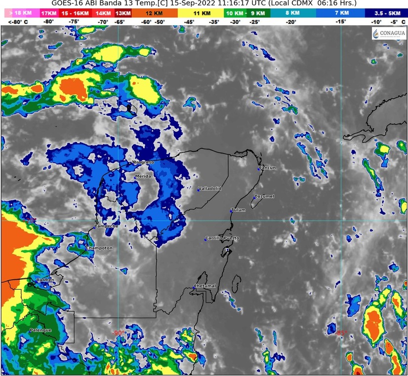 1.-La vaguada térmica (canal de baja presión) ubicada en superficie en la porción occidental del Golfo de México, en su muy amplia circulación impulsa aire marítimo tropical con variable contenido de humedad hacia la región peninsular; originará temperaturas calurosas a bochornosas durante el día y parte de la noche, cielo medio nublado a nublado, lluvias con chubascos aislados acompañados de actividad eléctrica más frecuentes por la tarde y noche sobre la mayor parte del estado de Quintana Roo.