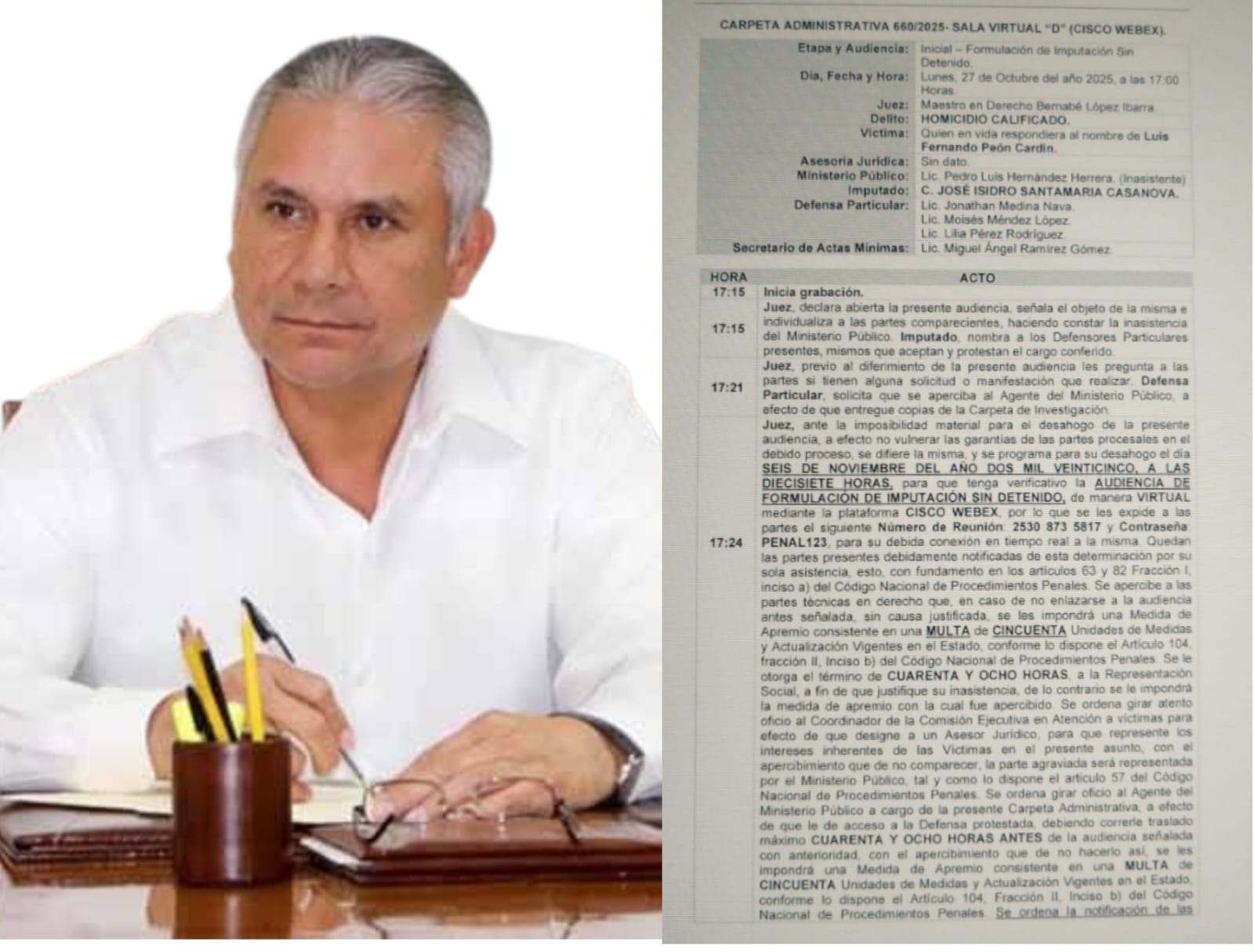 Ahora con la inasistencia de la Fiscalía a la audiencia inicial convocada para el pasado lunes 27, deberá presentarse el próximo 6 de noviembre a comparecer y presentar la carpeta de investigación que sustenta sus pruebas.
