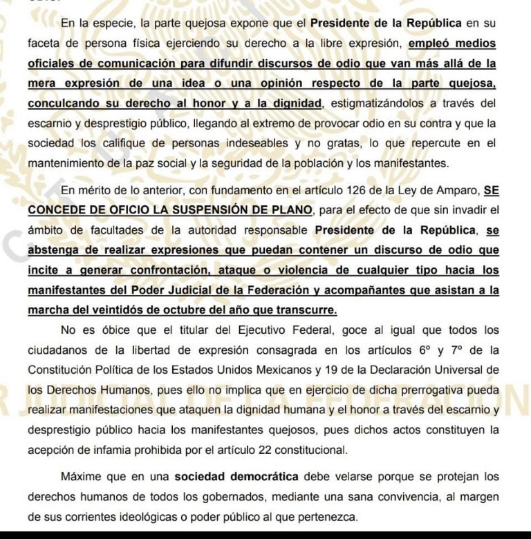 De acuerdo con el documento, se concedió una suspensión de plano para que el mandatario se “abstenga de realizar expresiones que puedan contener un discurso de odio que incite a generar confrontación, ataque o violencia de cualquier tipo hacia los manifestantes del Poder Judicial de la Federación y acompañantes que asistan a la marcha del 22 del octubre del año que transcurre”.