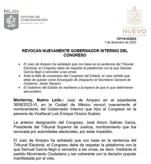 En vísperas de que el gobernador interino designado por el Congreso, Luis Enrique Orozco, el juez argumentó que, con base en la sentencia del Tribunal Electoral, el Congreso debe de respetar la plataforma con la que Samuel García llegó a vencedor a las urnas, es decir, mediante el partido Movimiento Ciudadano y ser coherente con la decisión popular manifestada por el voto.