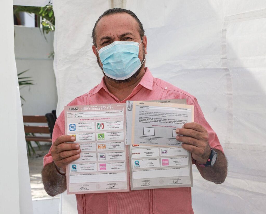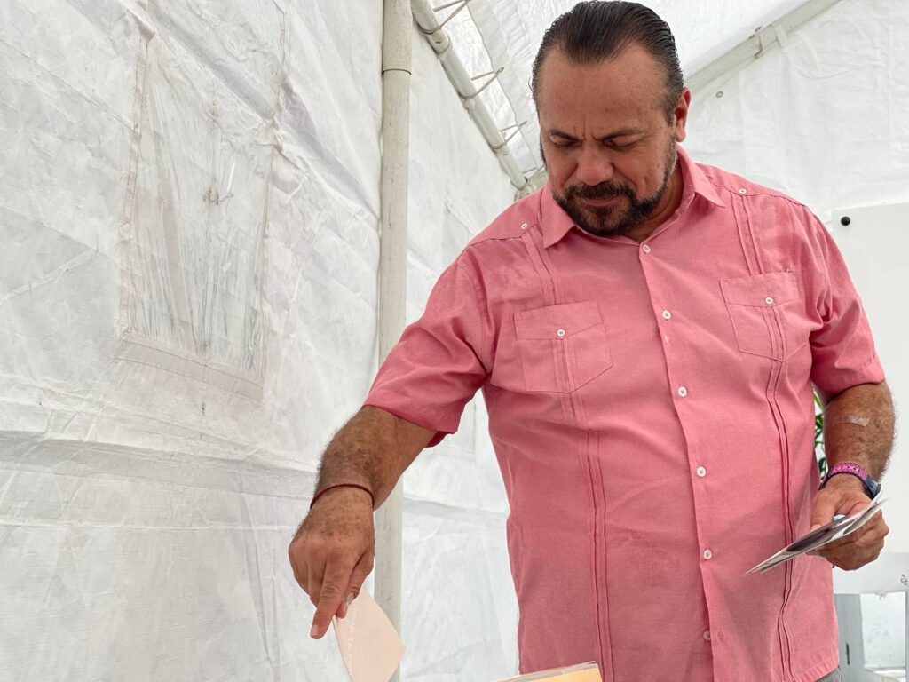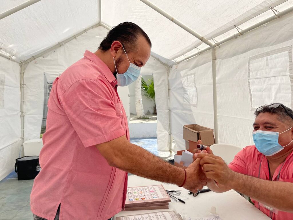 ISLA MUJERES. – El candidato del Distrito 01 por la alianza Juntos Hacemos Historia en Quintana Roo, Julián Ricalde Magaña, acudió a votar a la casilla instalada en la explanada del parque principal de la isla, entre las calles Miguel Hidalgo y Vicente Guerrero, para la elección de diputados locales y gobernador del estado.