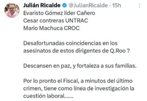 Cancún(Marcrix Noticias).- Luego del asesinato del dirigente de la CROC en Cancún, Mario Machuca Sánchez, el exdiputado local Julián Ricalde Magaña publicó un mensaje en redes sociales donde advirtió posibles coincidencias entre los recientes homicidios de líderes sindicales en Quintana Roo.
