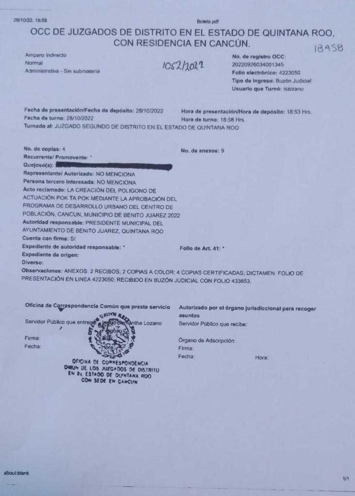 Cancún (Marcrix Noticias).- Como resultado del acercamiento de un grupo de vecinos del Polígono Pok Ta Pok a la Asociación Opus Magnum de México, el pasado 9 de noviembre de este 2022, el Juzgado Segundo de Distrito concedió la Suspensión Provisional derivada del amparo 1062/2022, con efecto de suspender la emisión de licencias de construcción y/o ampliación de edificaciones en el polígono “Pok Ta Pok”, derivado del Programa Municipal de Desarrollo Urbano del Centro de Población Cancún (PDU 2022).