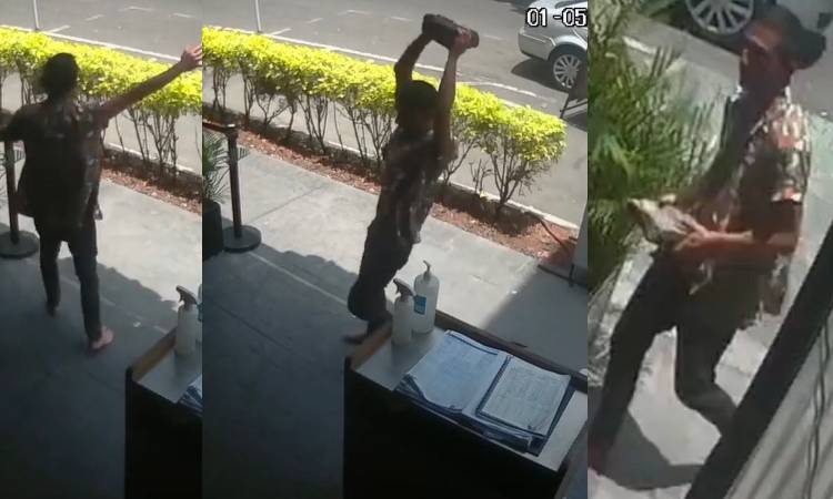 Las imágenes dan cuenta de cómo, ayer 1 de mayo, alrededor de las 13:00 horas, un sujeto descalzo que lleva camisa abierta, pantalón de mezclilla y que carga una aparente piedra pesada con ambas manos, se acerca a la mesa de un restaurante donde hay dos comensales.