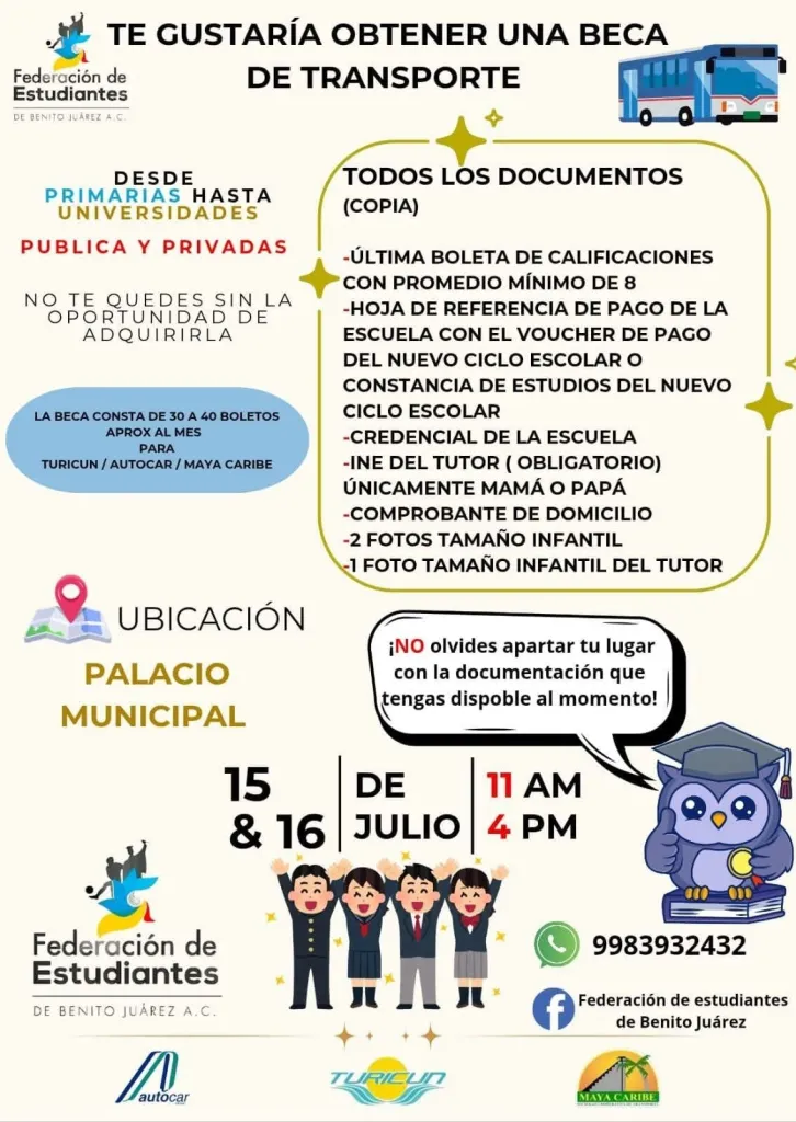 Cancún, (Marcrix Noticias) — Con el objetivo de apoyar a las familias en el gasto mensual de movilidad, la Federación de Estudiantes de Benito Juárez A.C. lanzó una nueva convocatoria para acceder a becas de transporte en Cancún, dirigidas a estudiantes de primaria, secundaria, bachillerato y universidad, ya sea en instituciones públicas o privadas.