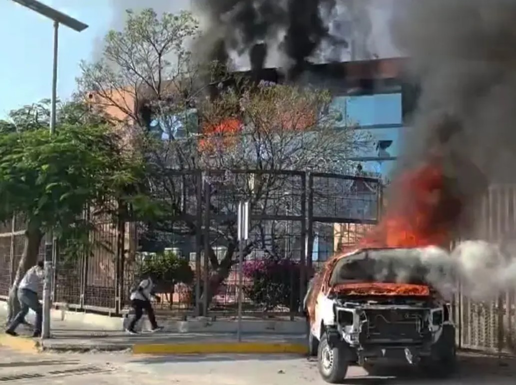 Entre los materiales difundidos, se observa a personas con mochilas lanzar objetos contra la sede de gobierno mientras se incendia una camioneta.