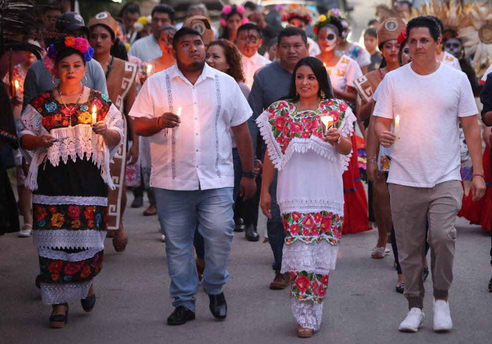 Al frente de la procesión, que recorre diversas calles de la delegación, camina la presidenta municipal Blanca Merari Tziu Muñoz, vestida con un colorido terno. La acompañan regidores, servidores públicos y vecinos, quienes con velas y veladoras entre las manos, iluminan el camino que las ánimas deben seguirán para llegar a casa y disfrutar la comida y la bebida que preferían en vida y hoy les preparan sus deudos.