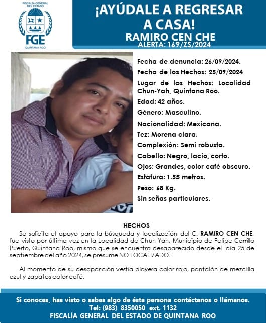 Los familiares del ex comisariado interpusieron una denuncia ante la Fiscalía de Quintana Roo, la cual emitió una ficha de búsqueda la tarde del jueves.