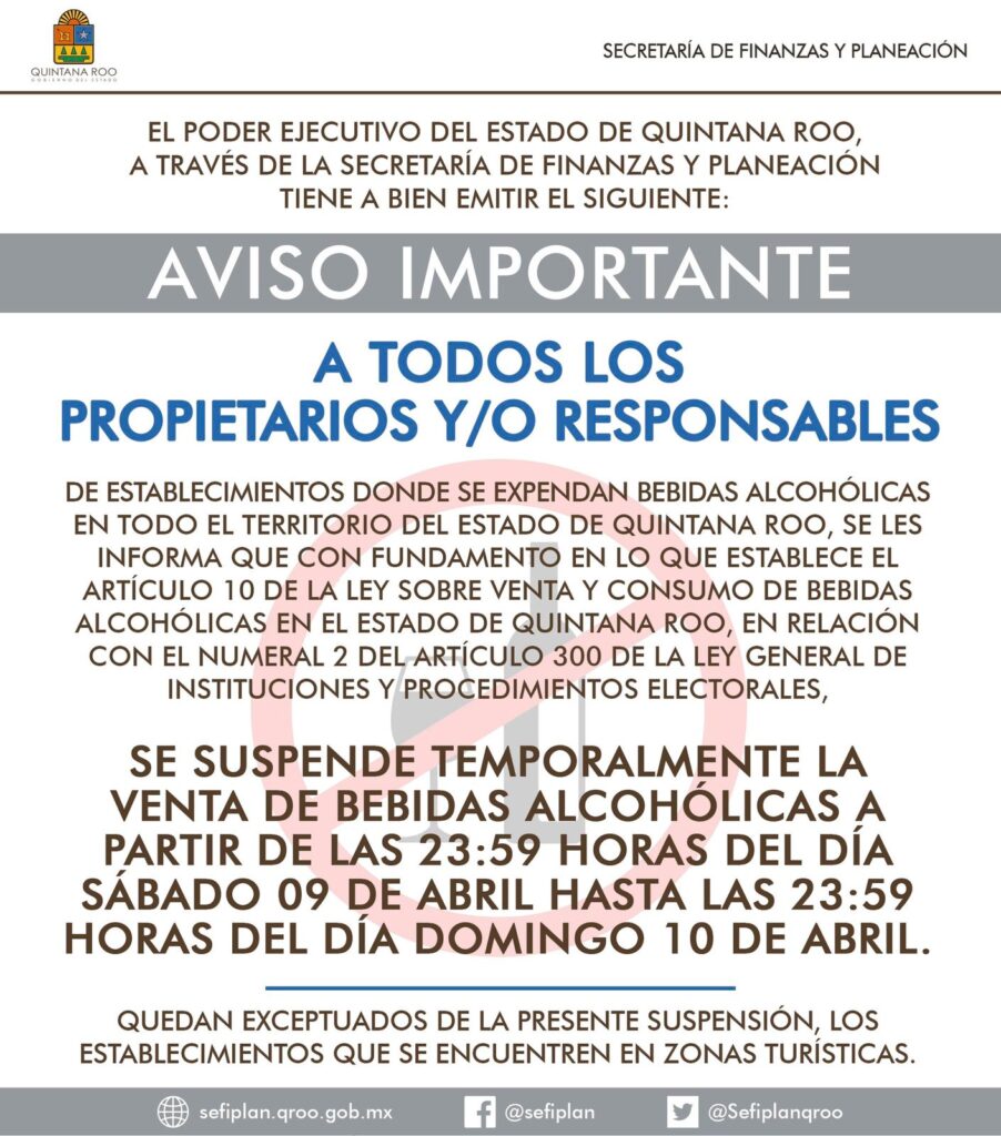 El día de hoy la SEFIPLAN anunció Ley Seca para Quintana Roo, la cual entra en vigor a partir de las 23 horas con 59 minutos del sábado 9 hasta las 23 horas con 59 minutos del domingo 10 de abril.