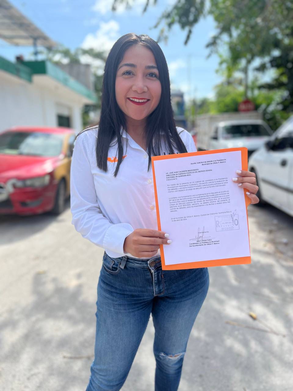 - La abanderada naranja entregó la solicitud para debates ante el IEQROO