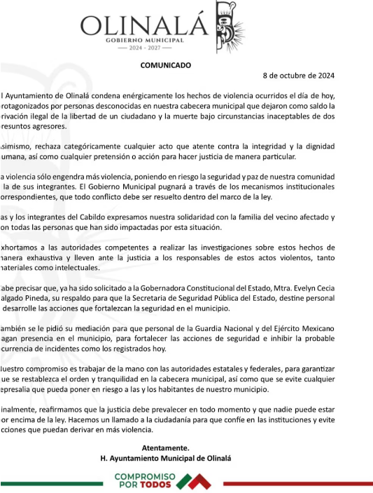 A través de un comunicado, el gobierno municipal condenó el linchamiento, enfatizando que la violencia no es la solución a los problemas de seguridad que enfrenta la región.