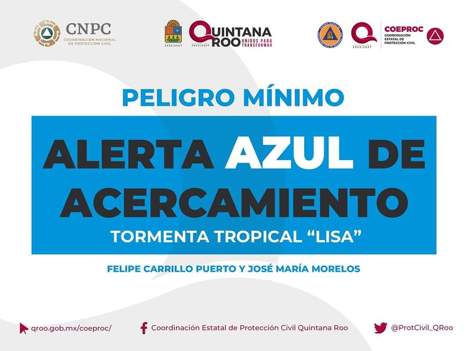 Chetumal (Marcrix Noticias).- Este martes se activó alerta verde para Othón P. Blanco y Bacalar y azul para Felipe Carrillo Puerto y José María Morelos, ante la proximidad de la tormenta tropical “Lisa”.