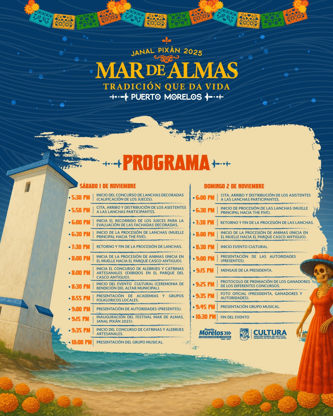 Puerto Morelos (Marcrix Noticias).– “La conmemoración del Día de Muertos es una de las tradiciones más representativas de México, que cautiva al mundo con sus colores, aromas y símbolos de amor eterno. En Puerto Morelos, el Janal Pixan no solo celebra la memoria de nuestros seres queridos, sino que también promueve la sana convivencia, impulsa la economía local y fortalece la identidad cultural que distingue a nuestro destino”, afirmó la presidenta municipal Blanca Merari Tziu Muñoz.