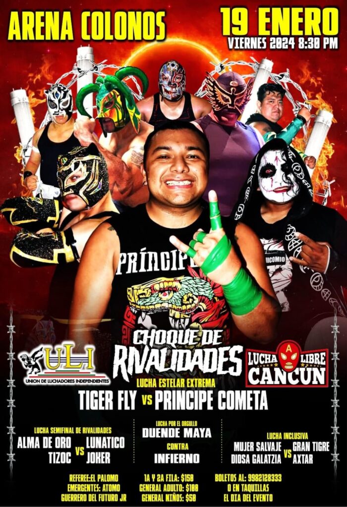 Por lo pronto, las empresas Lucha Libre Cancún (LLC) que preside Amador Gutiérrez Guigui, así como la Unión de Luchadores Independientes (ULI), dirigida por el luchador profesional y miembro de las “Máquinas del Mal”, Ángel de la Muerte; han unido esfuerzos una vez más, para presentar el próximo viernes 19 de enero, en punto de las 20:30 horas en la Arena “Colonos” de la SM89, la función denominada “Choque de Rivalidades”.