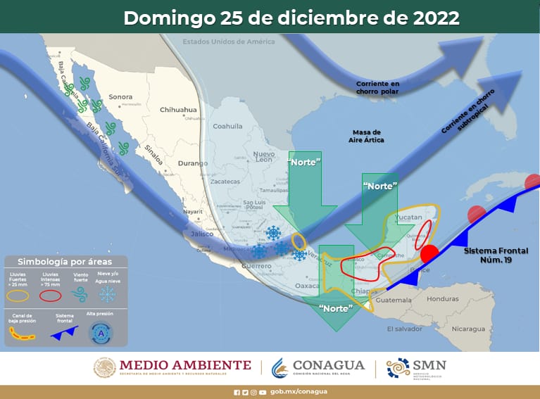 Cancún (Marcrix Noticias).- Un norte azotará este domingo de Navidad y el lunes debido al frente frío 19, lo que provocará lluvias y bajas temperaturas.