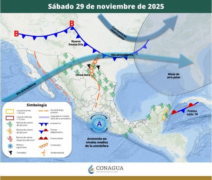 En el norte del territorio nacional, un nuevo frente frío se aproximará durante la tarde-noche e interactuará con una línea seca y la corriente en chorro subtropical, generando lluvias aisladas especialmente en Coahuila y Nuevo León.