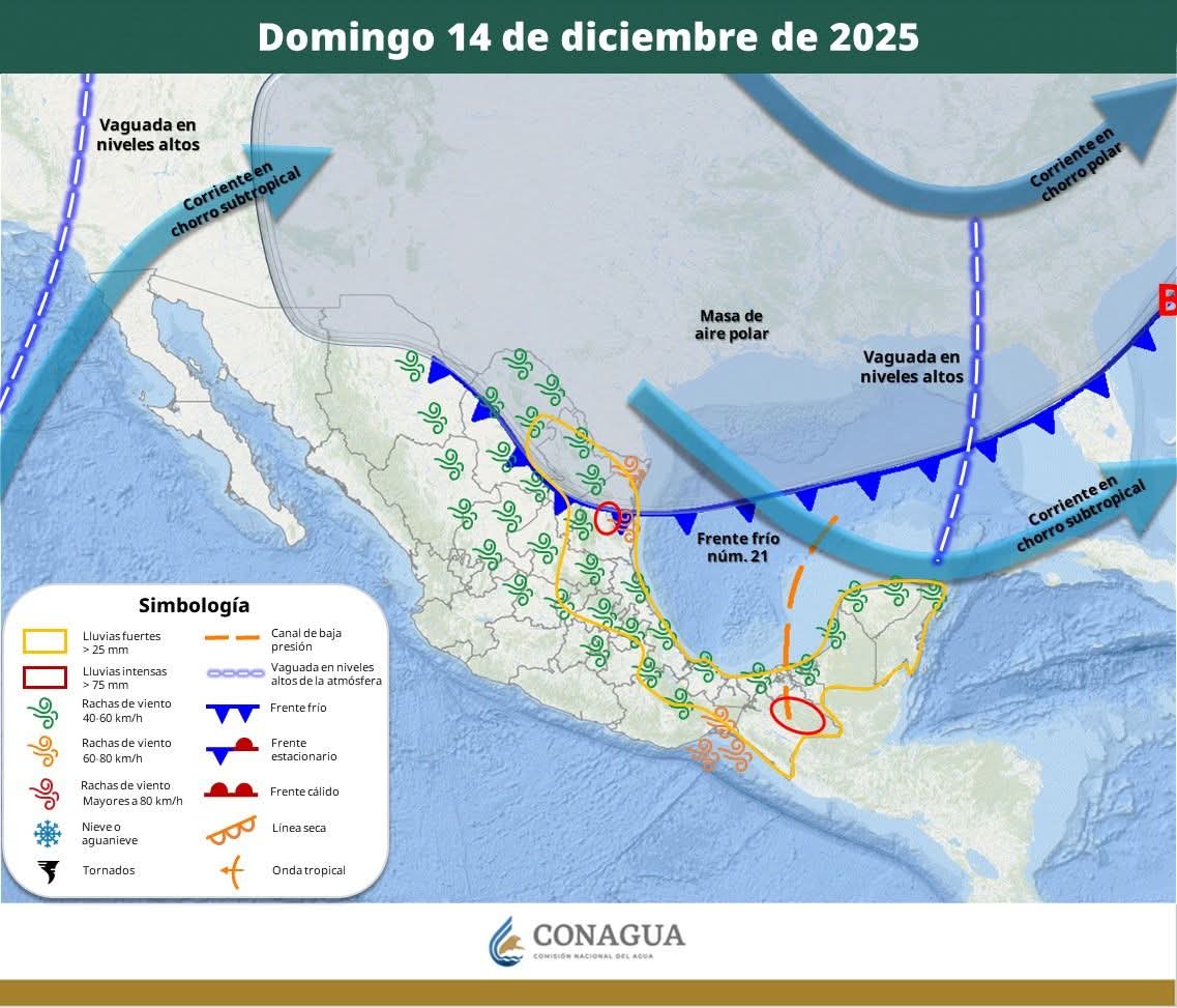 Estas condiciones están asociadas al desplazamiento del frente frío número 21, que interactúa con un canal de baja presión en el Golfo de México, así como con el ingreso de humedad proveniente del océano Pacífico, el Golfo y el mar Caribe, lo que favorece lluvias generalizadas en la Península de Yucatán y el sureste del país.
