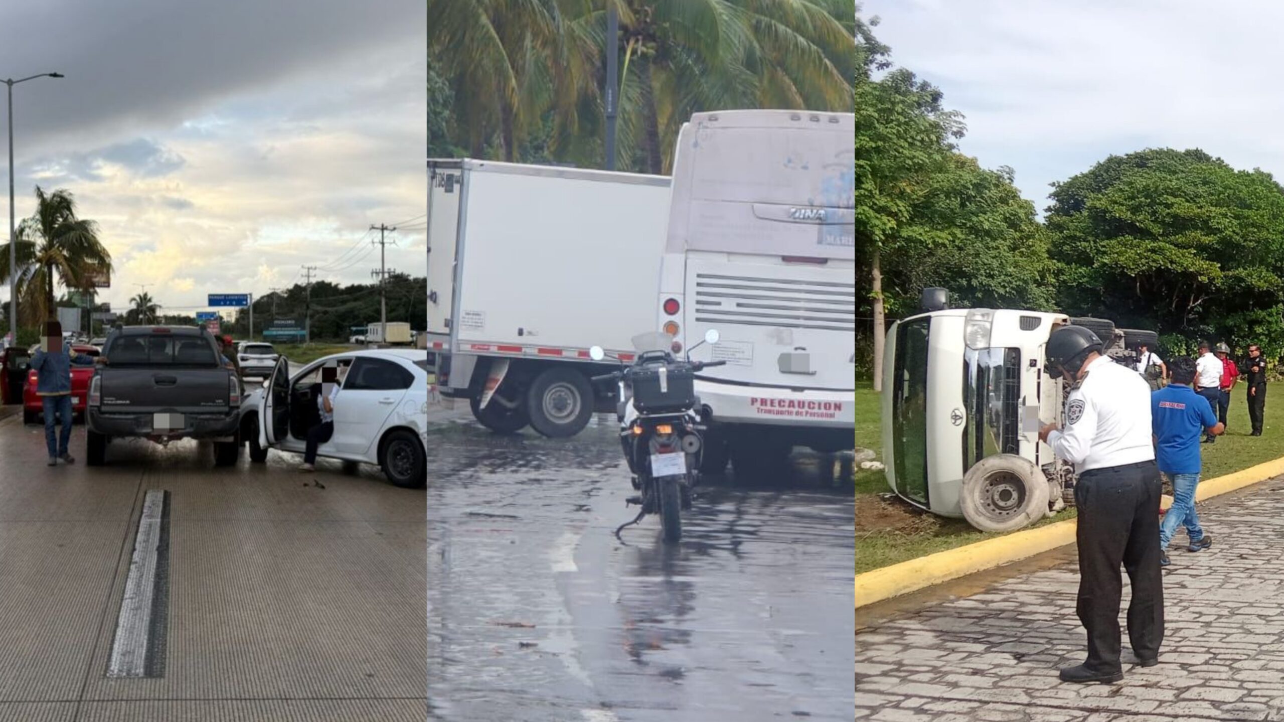 La cadena de accidentes continuó cerca de las 11:30 horas, cuando una camioneta Toyota Hiace de trabajadores de mantenimiento volcó en la glorieta de la avenida Palenque, en el cruce con avenida Xpuhil, frente a las Supermanzanas 26 y 27. El conductor perdió el control al tomar la glorieta, se subió al camellón central y terminó volcado sobre la vialidad.
