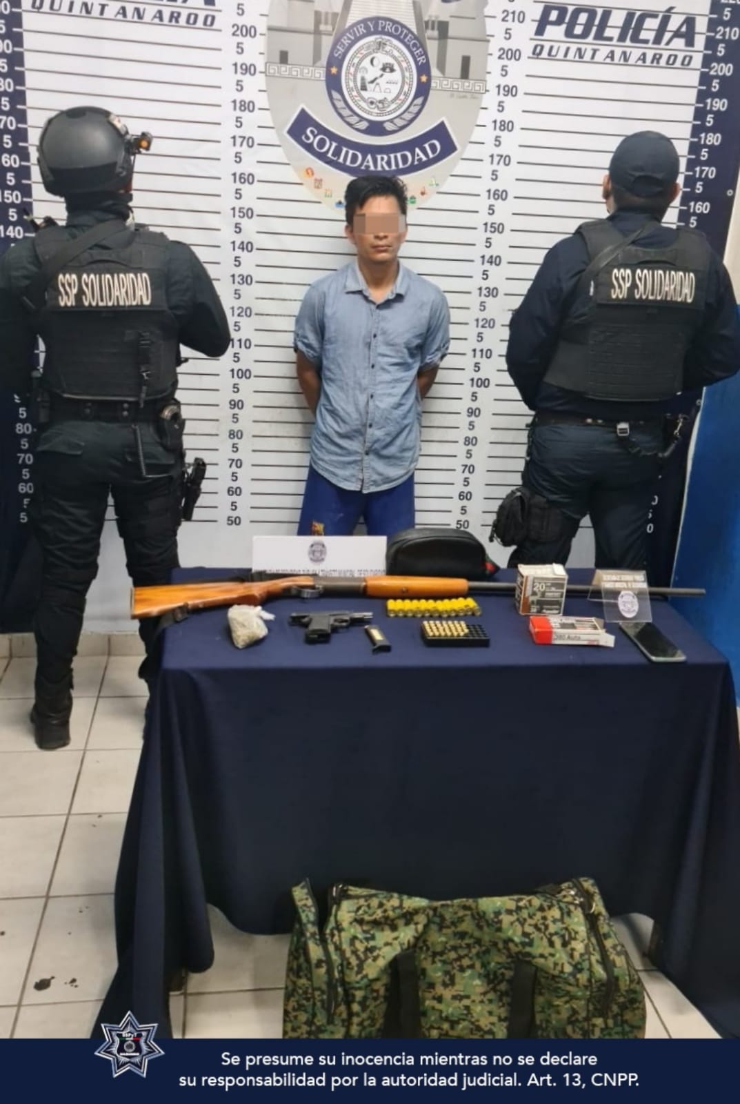 Playa del Carmen(Marcrix Noticias).- Como resultado del despliegue de más patrullas y elementos, policías de la Secretaría de Seguridad Pública y Tránsito Municipal aseguraron a un sujeto en posesión de 2 armas de fuego, cartuchos útiles de diversos calibres y narcóticos.