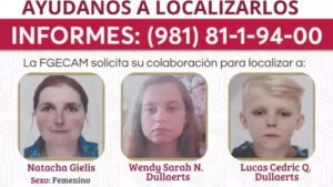 Ciudad de Campeche, Campeche. La Fiscalía General del Estado de Campeche informó que la familia belga reportada como desaparecida desde el 22 de octubre fue localizada con vida. Se trata de Natacha Gielis y sus hijos Wendy Sarah Dullaerts, de 15 años, y Lucas Cedric Dullaerts, de 12, quienes habían sido vistos por última vez cuando salieron de su domicilio en el municipio de Calkiní rumbo a la capital del estado.