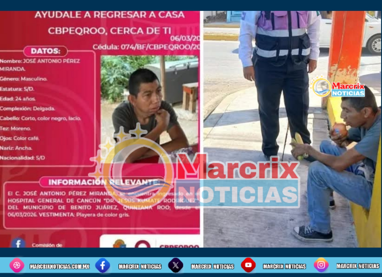 Cancún. ( Marcrix Noticias).- Autoridades localizaron con vida a un joven que contaba con ficha de búsqueda activa luego de desaparecer tras haber estado hospitalizado en el Hospital General de Isla Mujeres. La desaparición generó preocupación entre sus familiares, quienes reportaron que no sabían de su paradero después de que salió del nosocomio. �