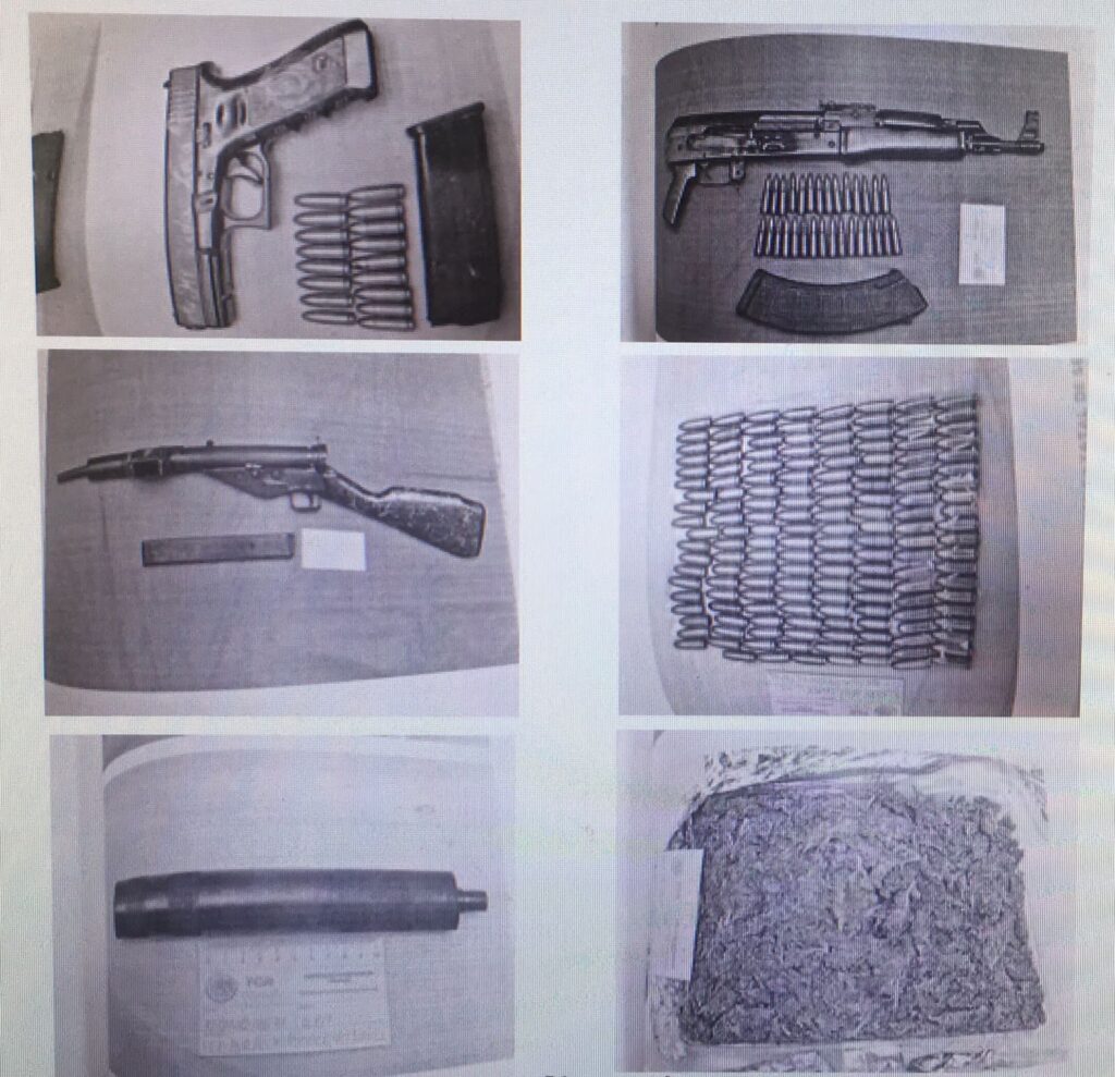 Durante la detención se les aseguraron: un arma de fuego larga tipo AK_47 con cargador abastecido con 30 cartuchos útiles, un arma de fuego corta calibre .9mm con cargador abastecido con 17 cartuchos útiles, un arma larga tipo escopeta calibre 9 por 19 mm, 21 cartuchos útiles calibre 7.62, 159 cartuchos útiles de diversos calibres, un silenciador y 538 gramos, siete miligramos de marihuana.